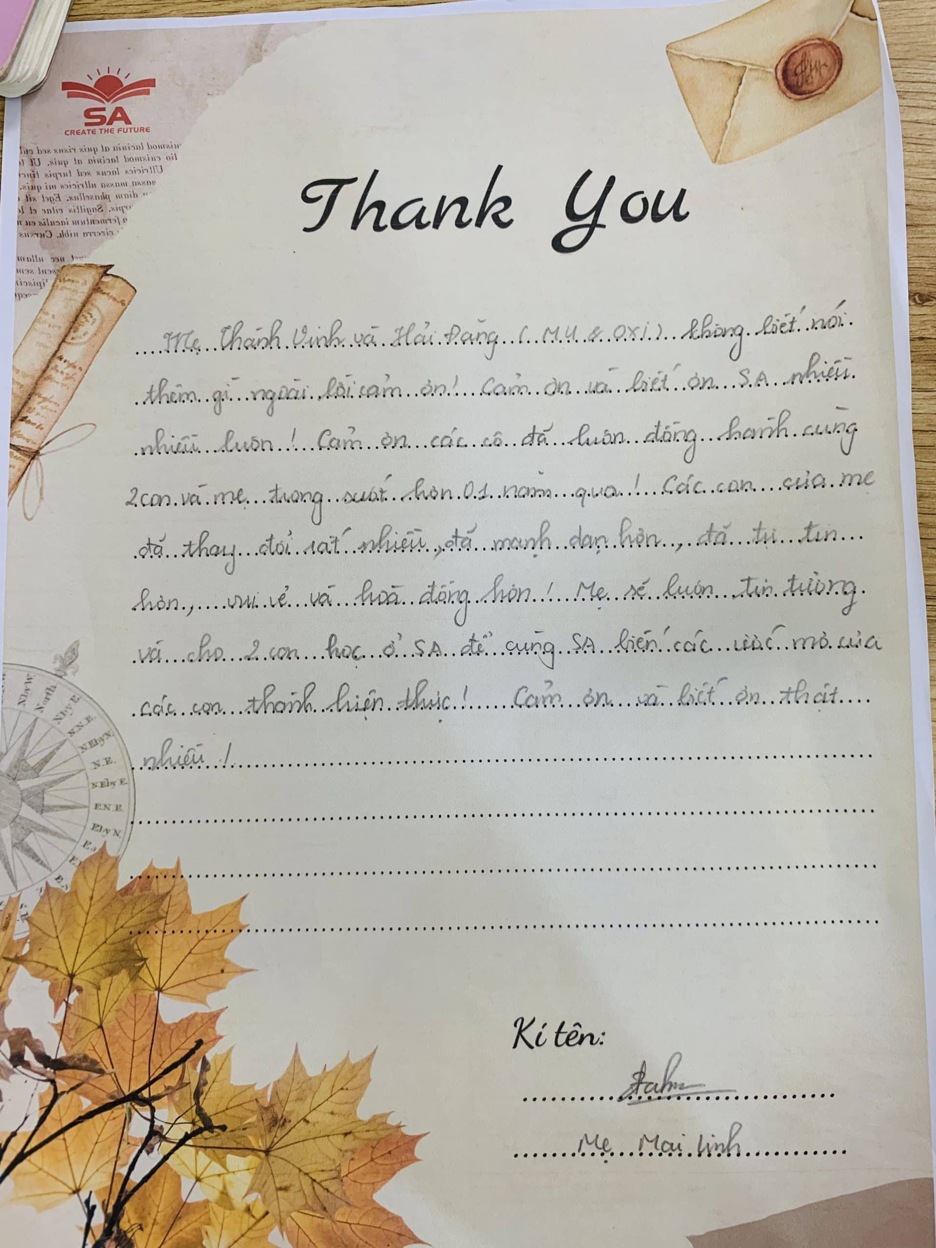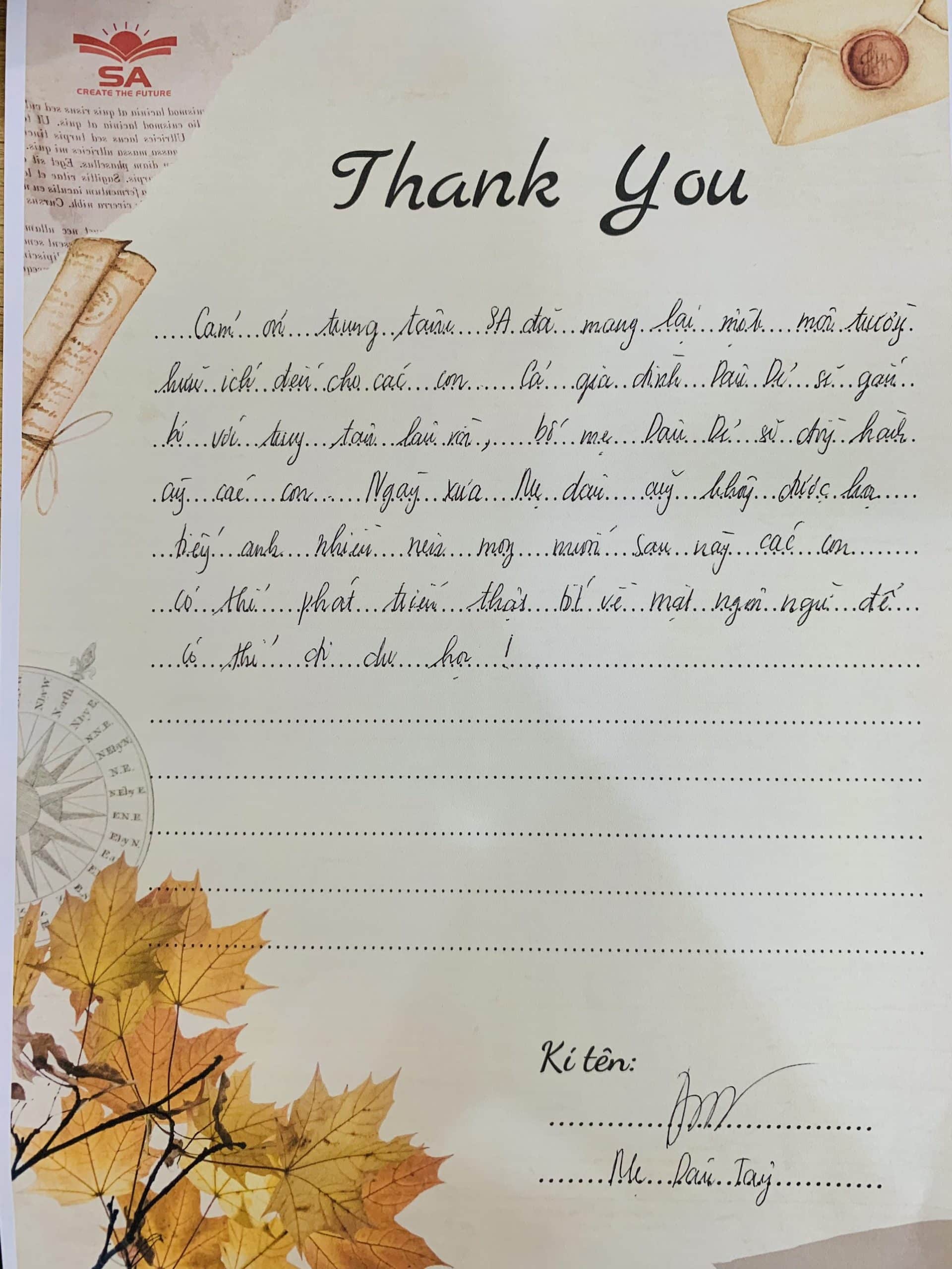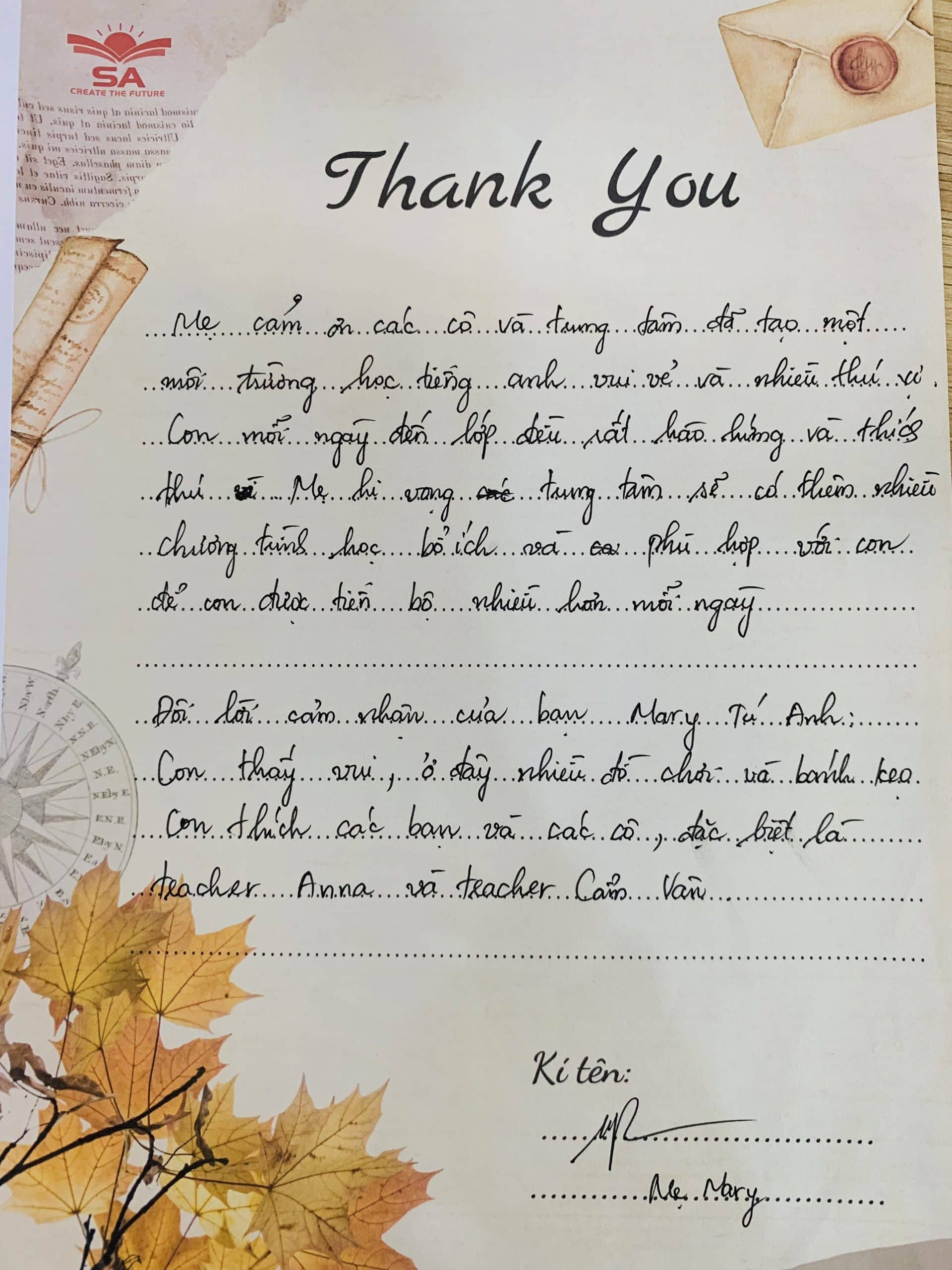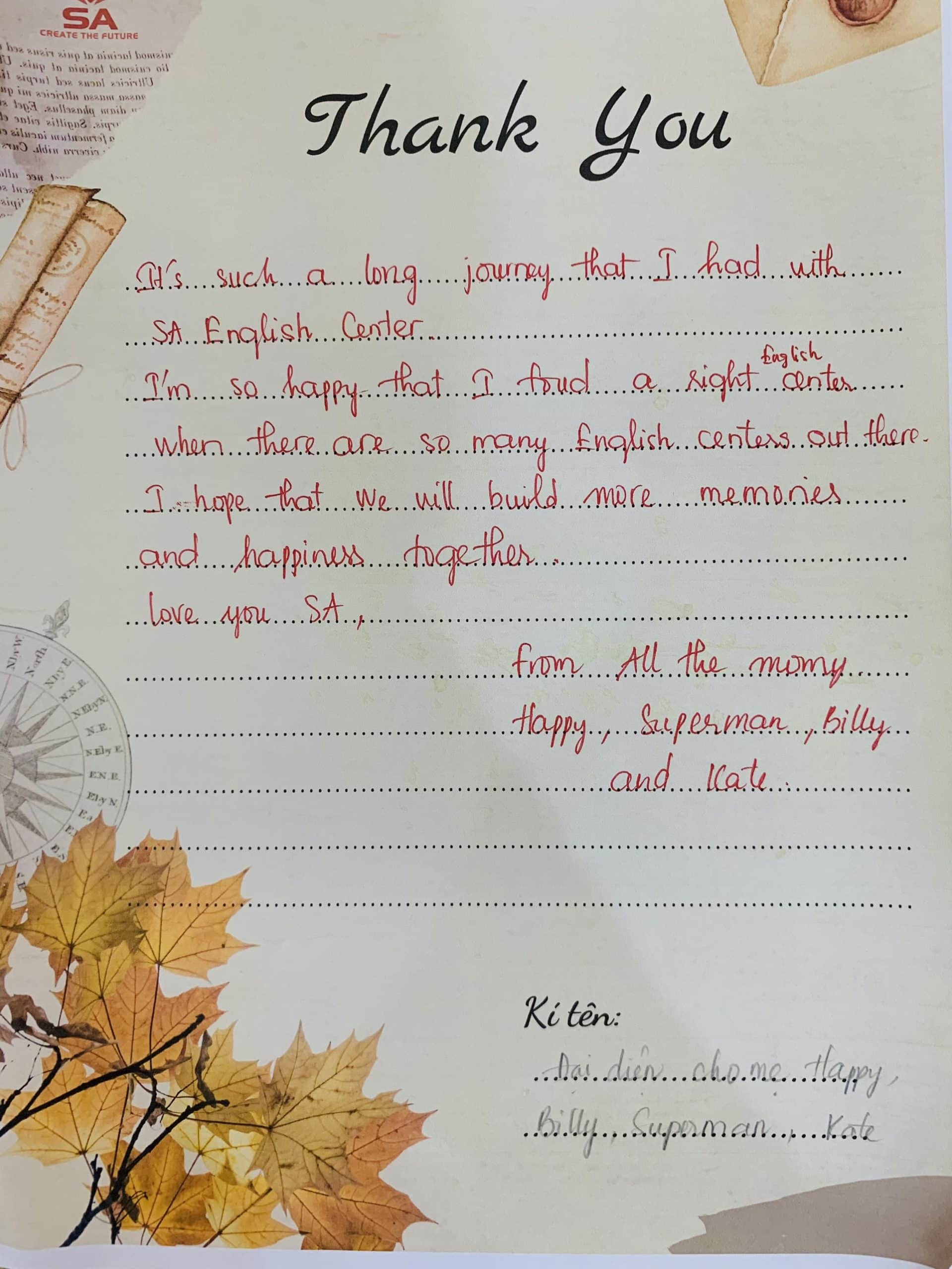 “Bức thư tình” này Anh Ngữ SA sẽ cất giữ mãi trong tim, trên hành trình chinh phục thế giới cùng các con, là thành tựu to lớn và vô giá nhất không gì mua được. Anh Ngữ SA trân quý vô cùng!
