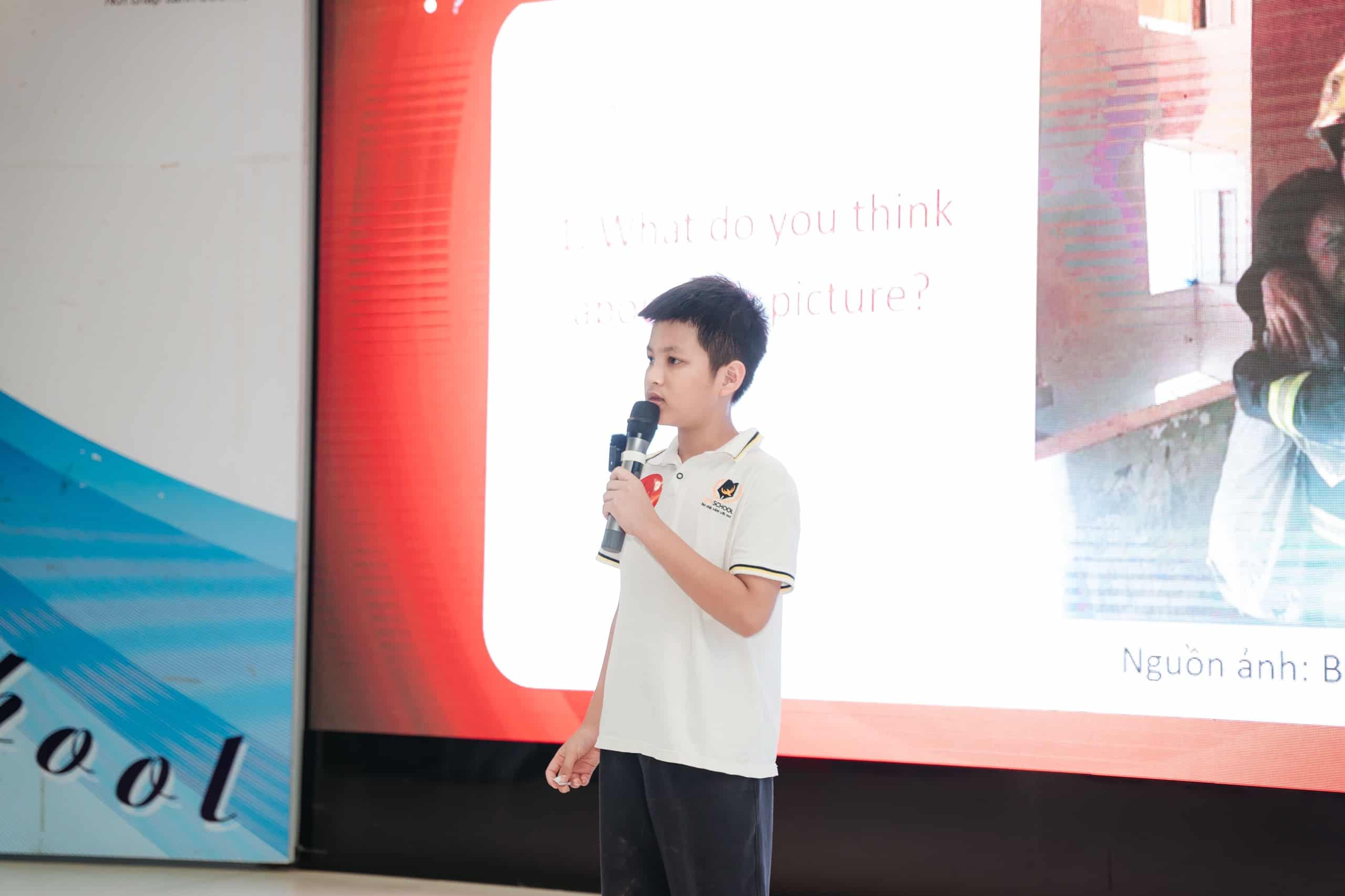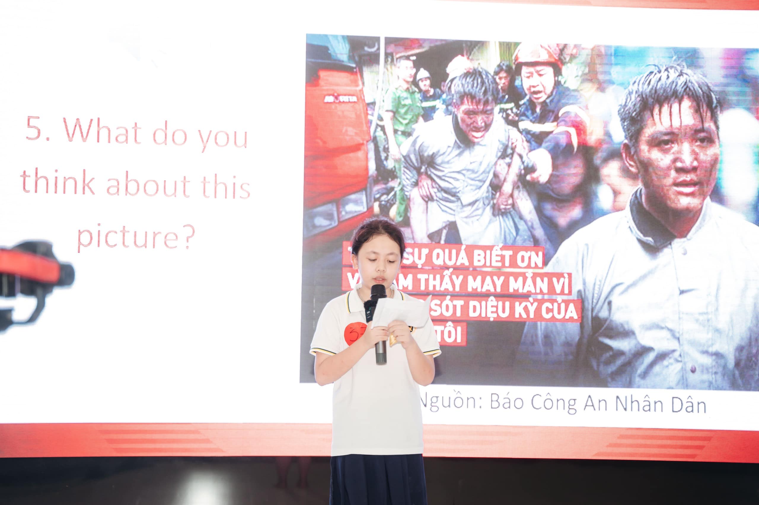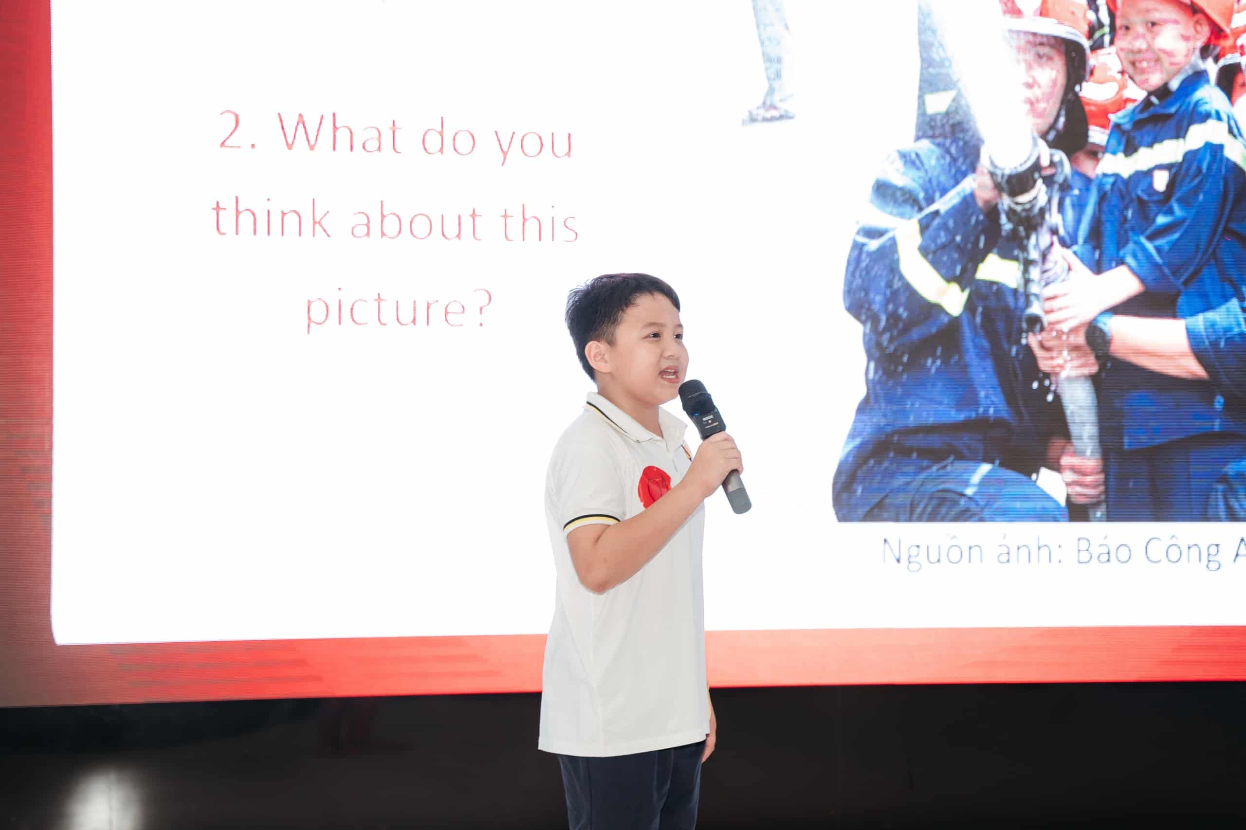 100 thí sinh đã cùng nhau chinh phục 50 câu hỏi 100% bằng tiếng Anh liên quan đến chủ đề phòng cháy chữa cháy và các lĩnh vực khác như văn hóa, xã hội, toán học, hội họa,… Đặc biệt vòng vấn đáp bằng Tiếng Anh dành cho Top 5 thí sinh xuất sắc nhất là đây là cơ hội tuyệt vời để các con thể hiện khả năng thuyết trình, sự tự tin và bản lĩnh sân khấu của mình. Các bạn học sinh và Quý Phụ huynh tham gia thi đều vô cùng phấn khởi, hứng thú.
